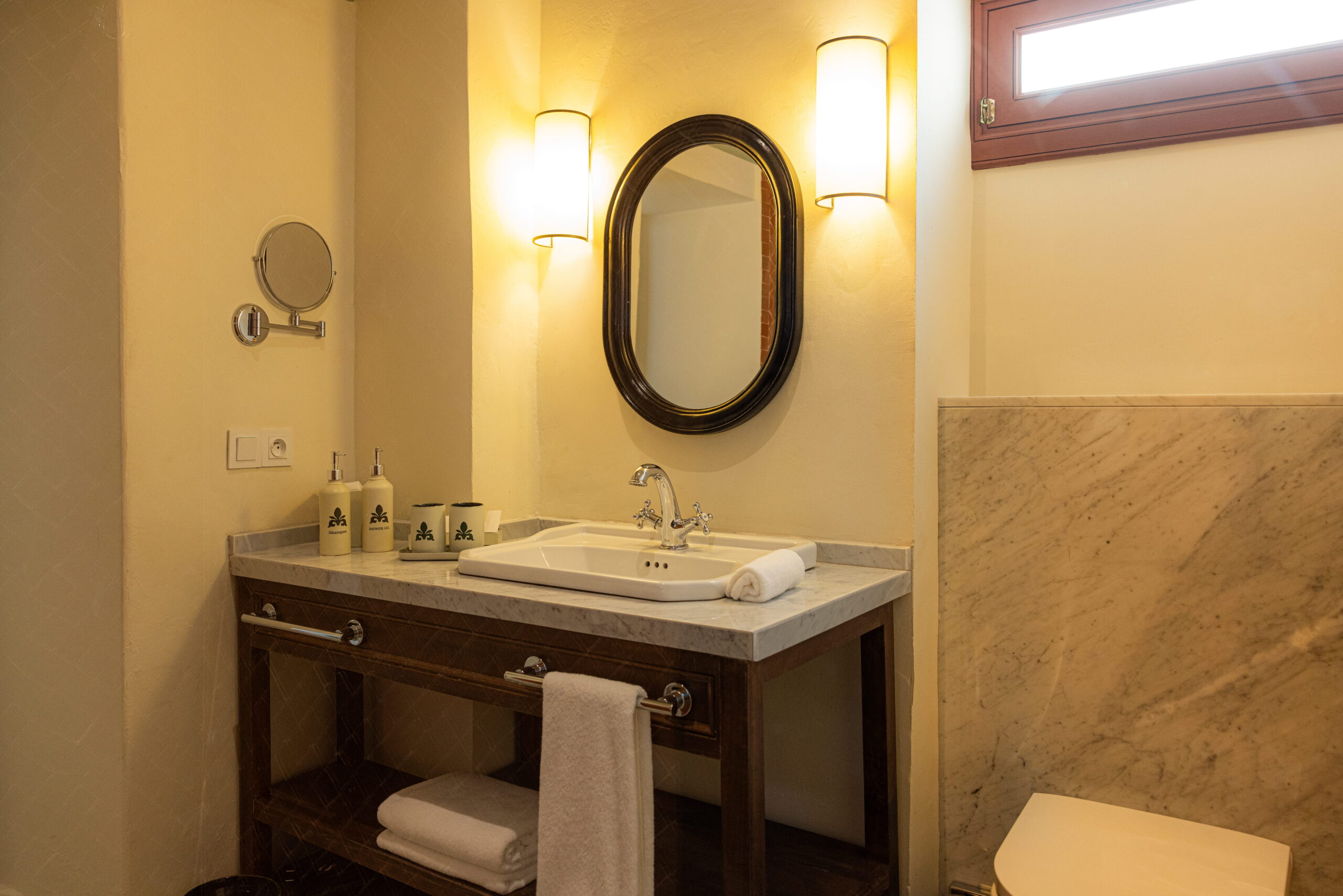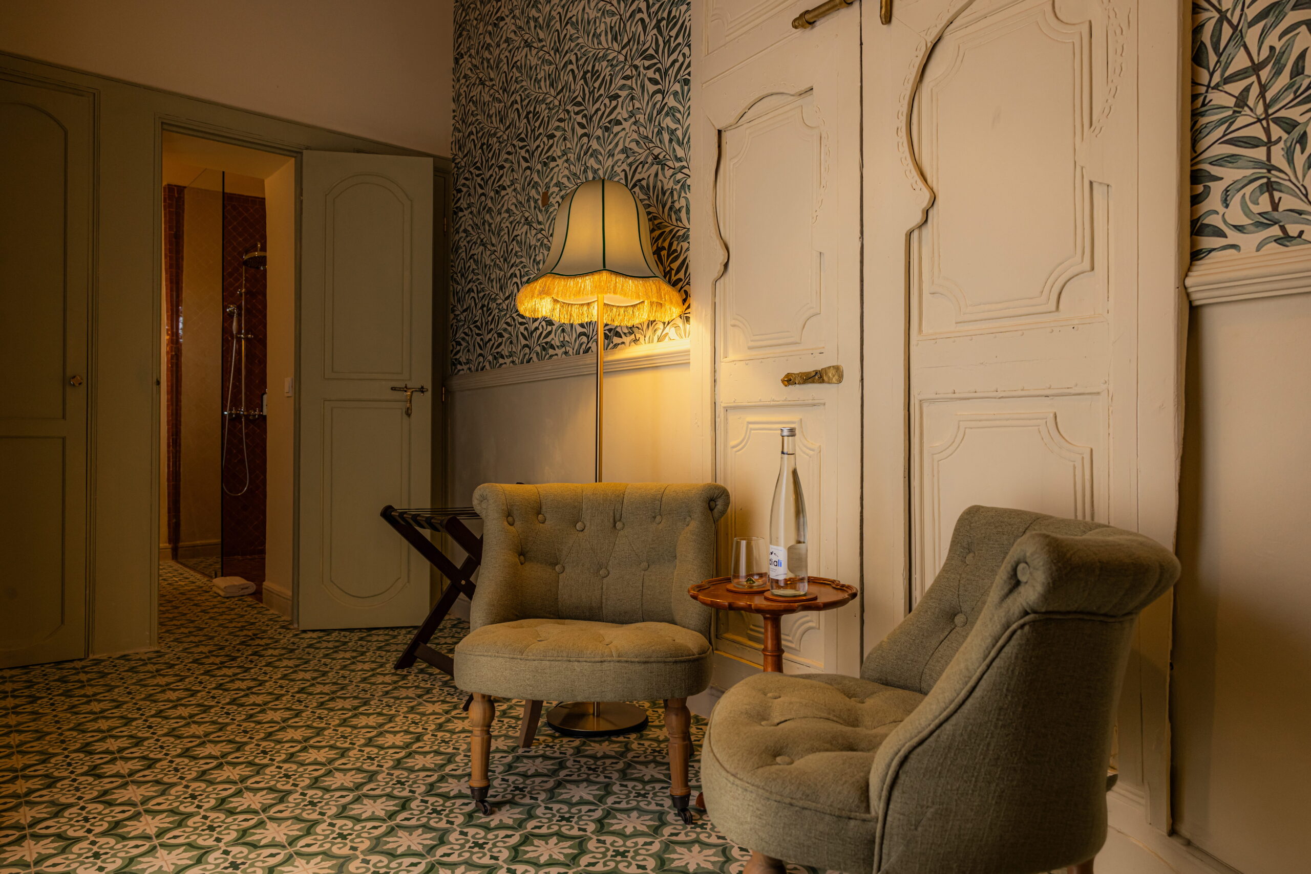 On accède à la chambre Wadih El Safi par le patio Douheria. Elle se dévoile comme un cocon élégant décliné dans une palette de verts naturels. Les murs sont habillés d’un papier peint au motif végétal, évoquant un jardin délicatement stylisé. La tête de lit sculptée en gebs, aux arches orientales finement ciselées, se pare d’un vert céladon mis en valeur par une lumière douce et feutrée.