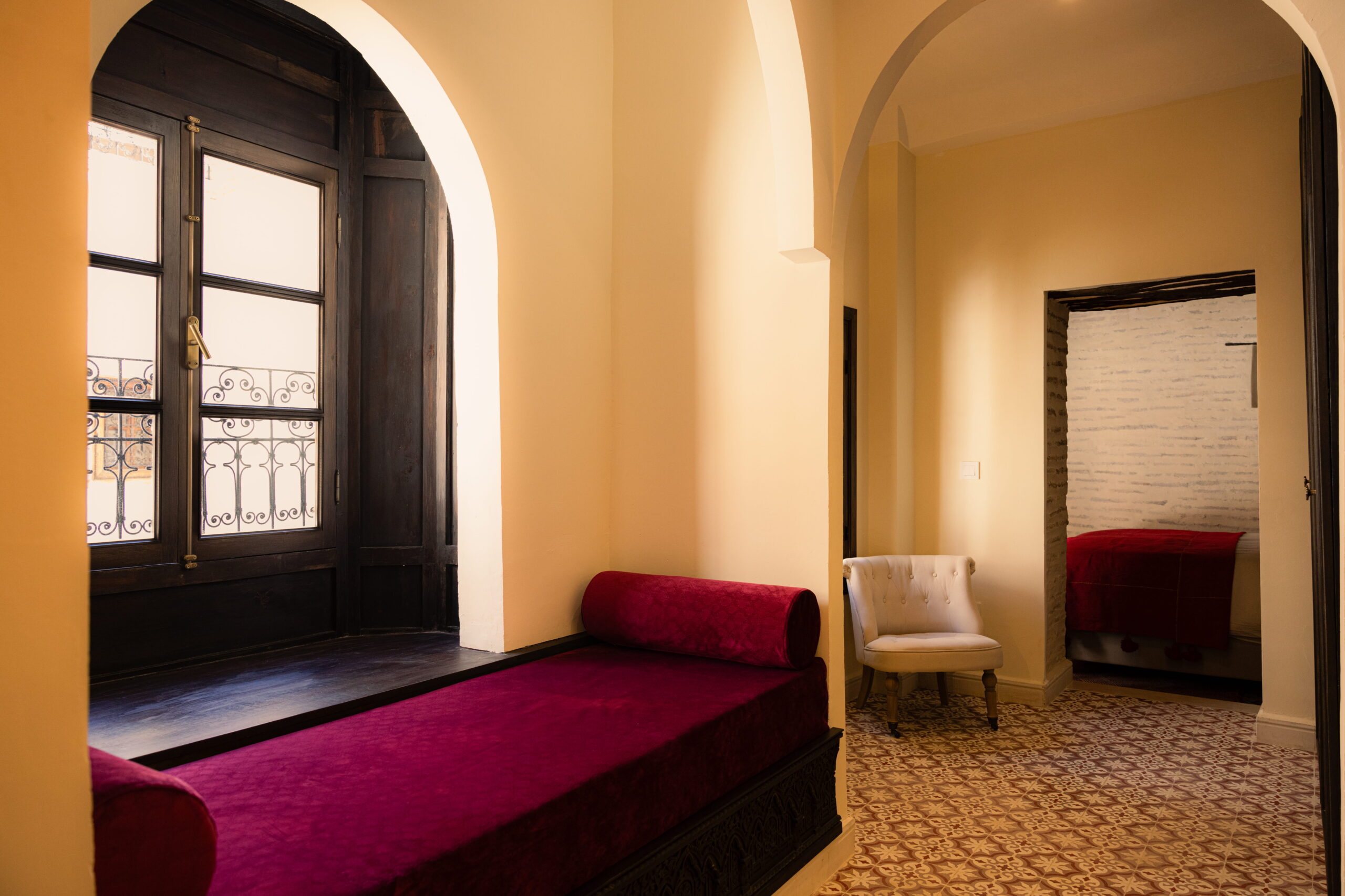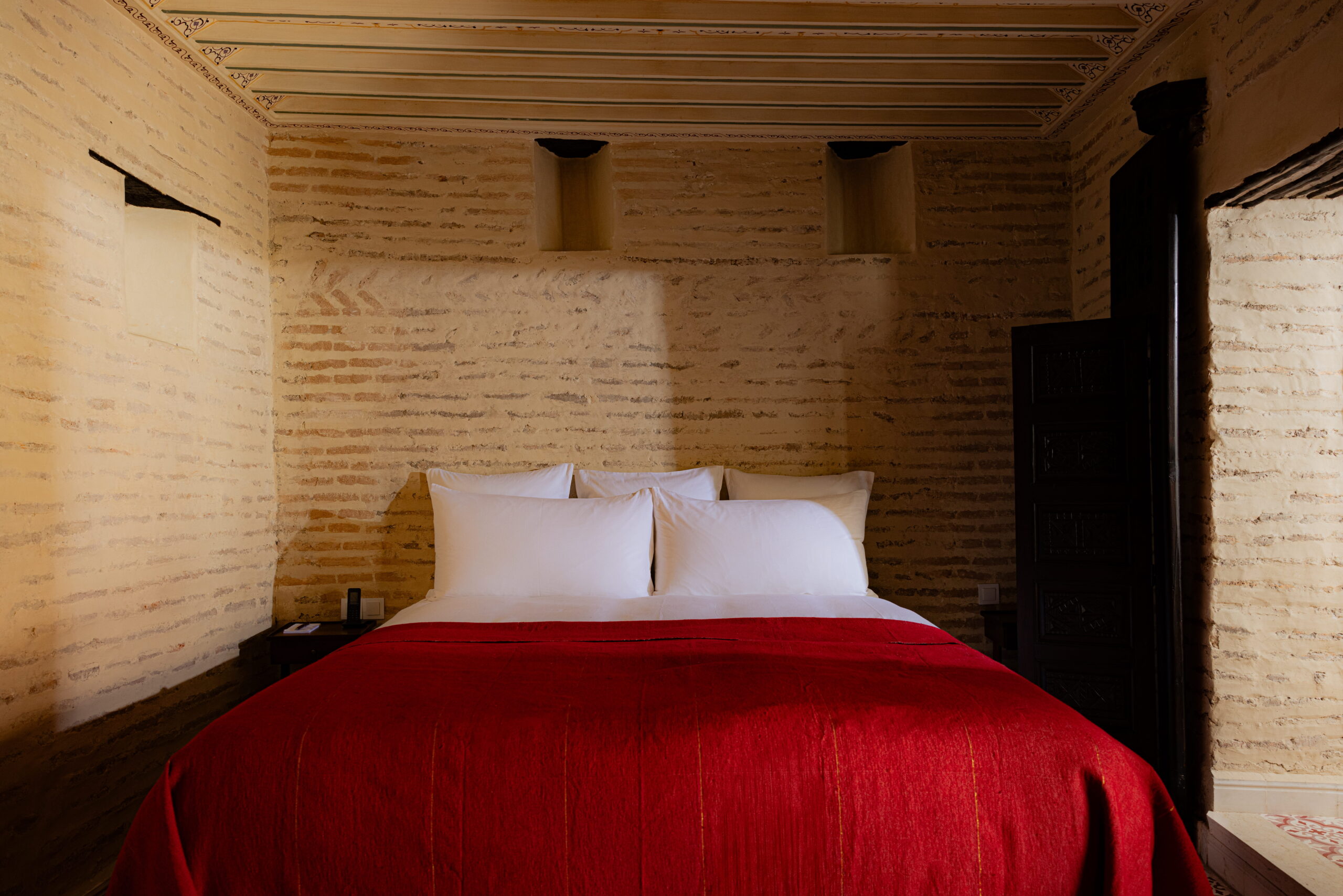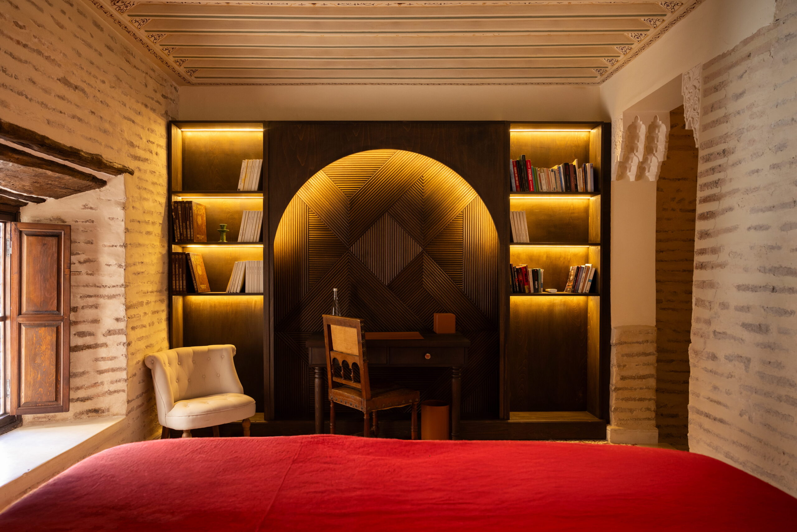 La suite Said Akl se distingue par sa bibliothèque en bois et son menzeh suspendu, offrant une vue plongeante sur le patio Berbère et ses orangers. Les nombreux détails décoratifs – tels que le zouak, plafond traditionnel peint, les portes anciennes en bois et le remarquable travail de menuiserie de la bibliothèque – confèrent à l’ensemble un caractère authentique et raffiné.Le sol est habillé de carreaux en ciment rouge terre, tandis que les murs en briques blanchies apportent douceur et luminosité à l’espace.