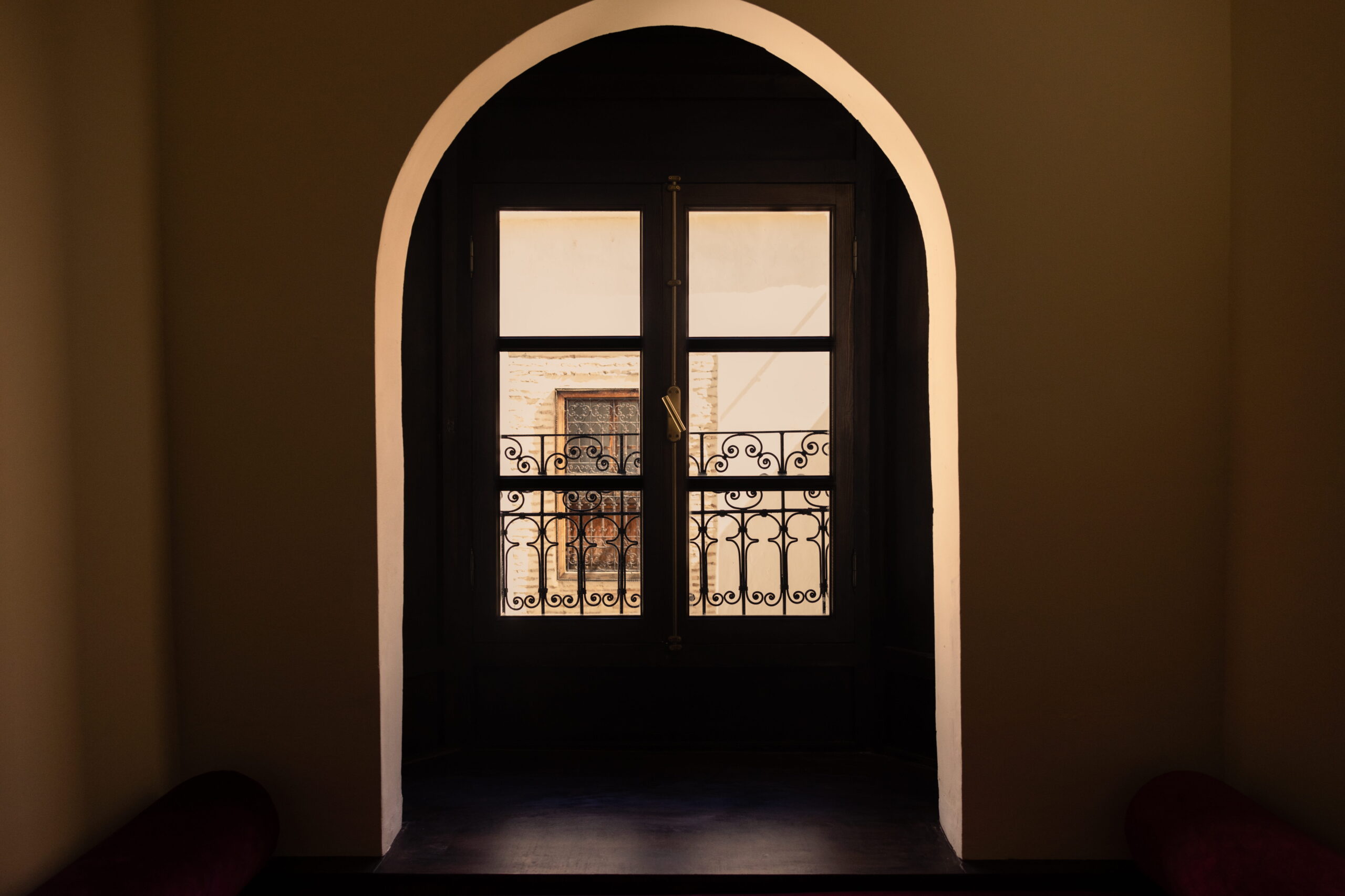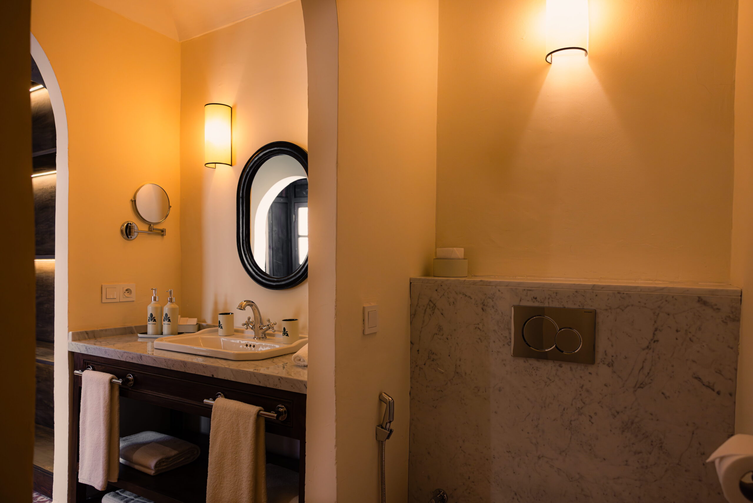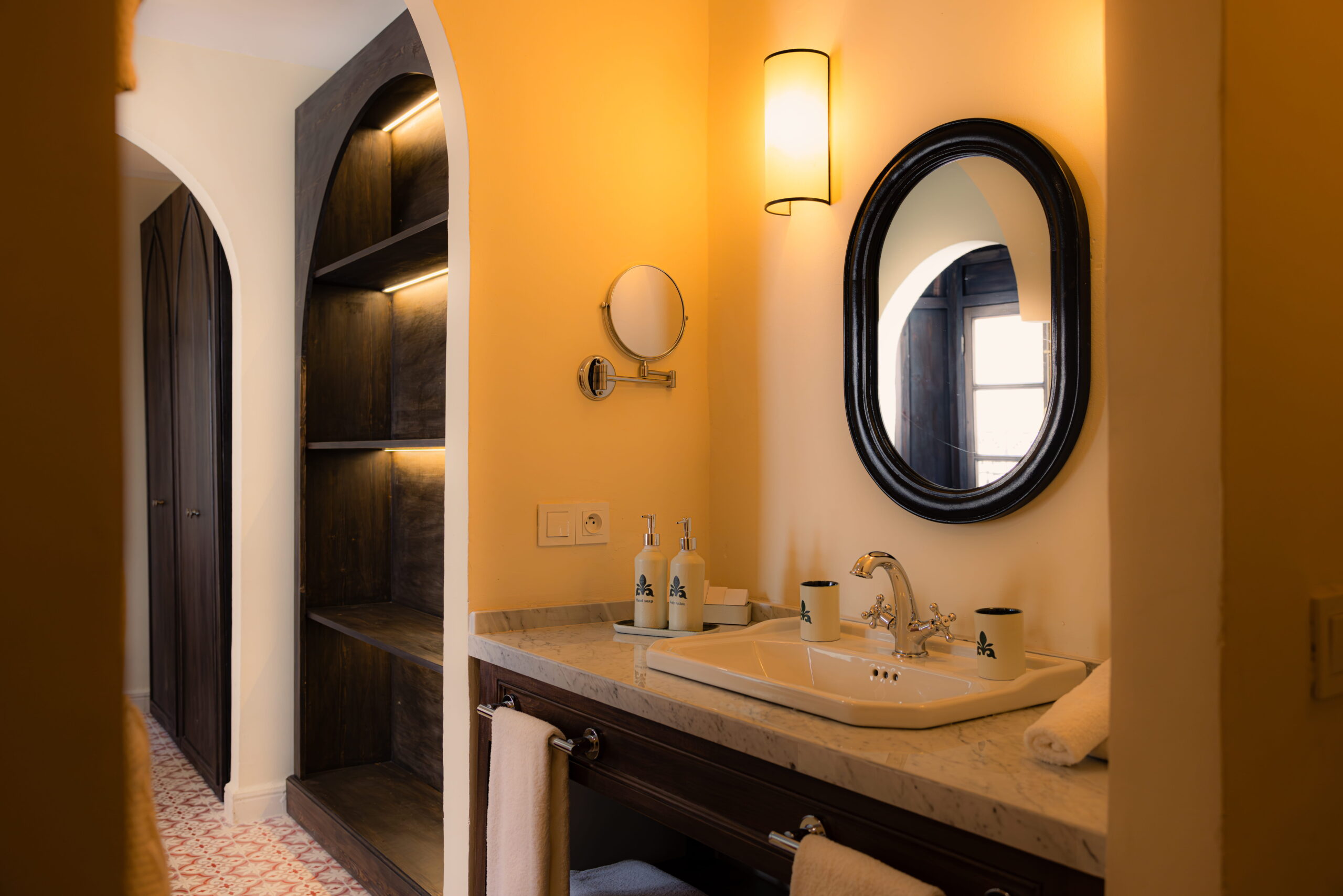 La suite Said Akl se distingue par sa bibliothèque en bois et son menzeh suspendu, offrant une vue plongeante sur le patio Berbère et ses orangers. Les nombreux détails décoratifs – tels que le zouak, plafond traditionnel peint, les portes anciennes en bois et le remarquable travail de menuiserie de la bibliothèque – confèrent à l’ensemble un caractère authentique et raffiné.Le sol est habillé de carreaux en ciment rouge terre, tandis que les murs en briques blanchies apportent douceur et luminosité à l’espace.